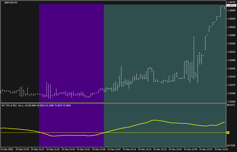 I would like the indicator to paint color chart or on indicator window when TDI market base line cross 50 level like shown in the image.
