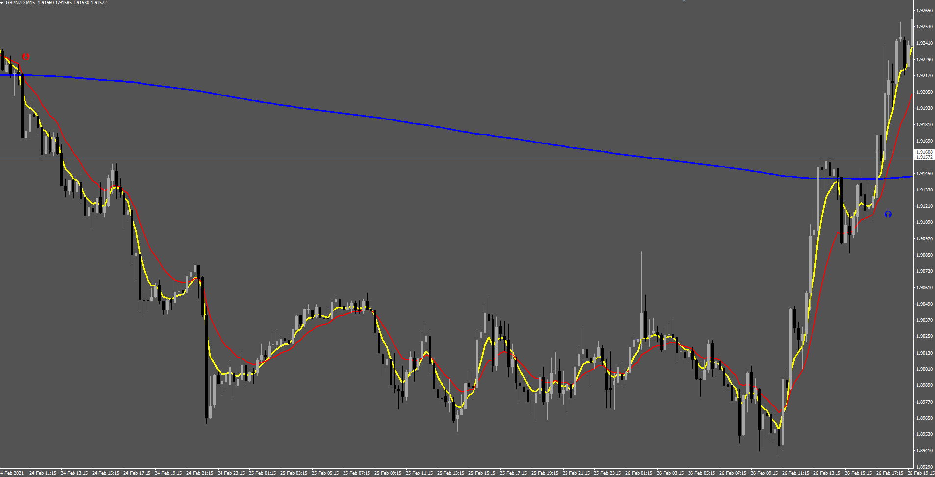 This first picture shows the signals given when the setting "Show fast/medium/slow ma cross arrows on/ff?" is set to true.