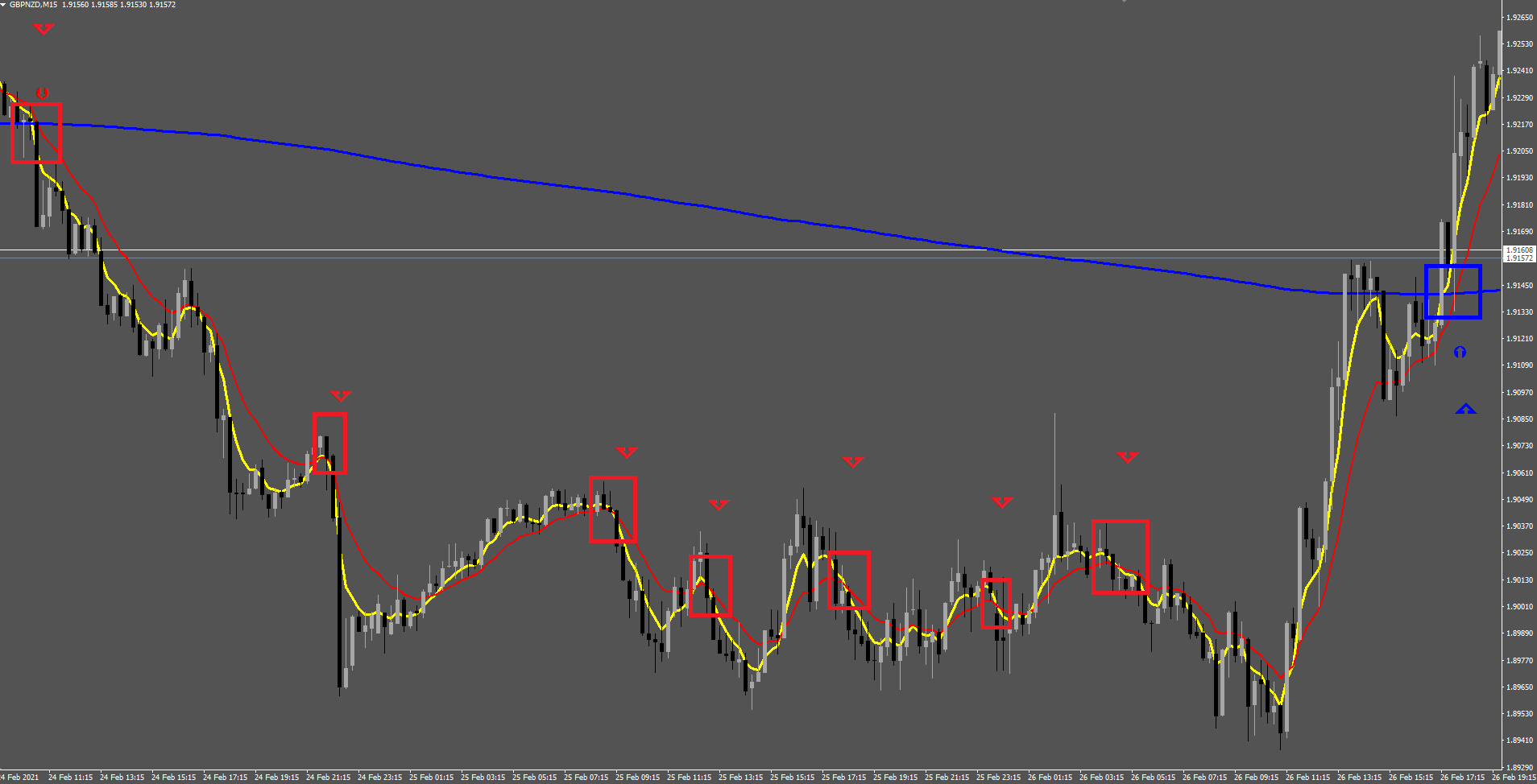 This first picture shows the signals given when the setting "Show fast/medium/slow ma cross arrows on/ff?" is set to true.