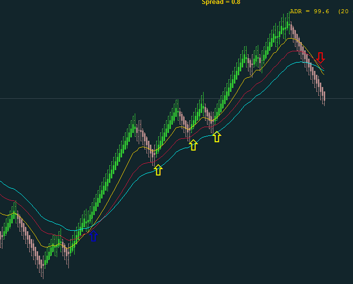 rule 1: EMA 20 and 50 cross; indicator to start looking for long trades alert (blue arrow)