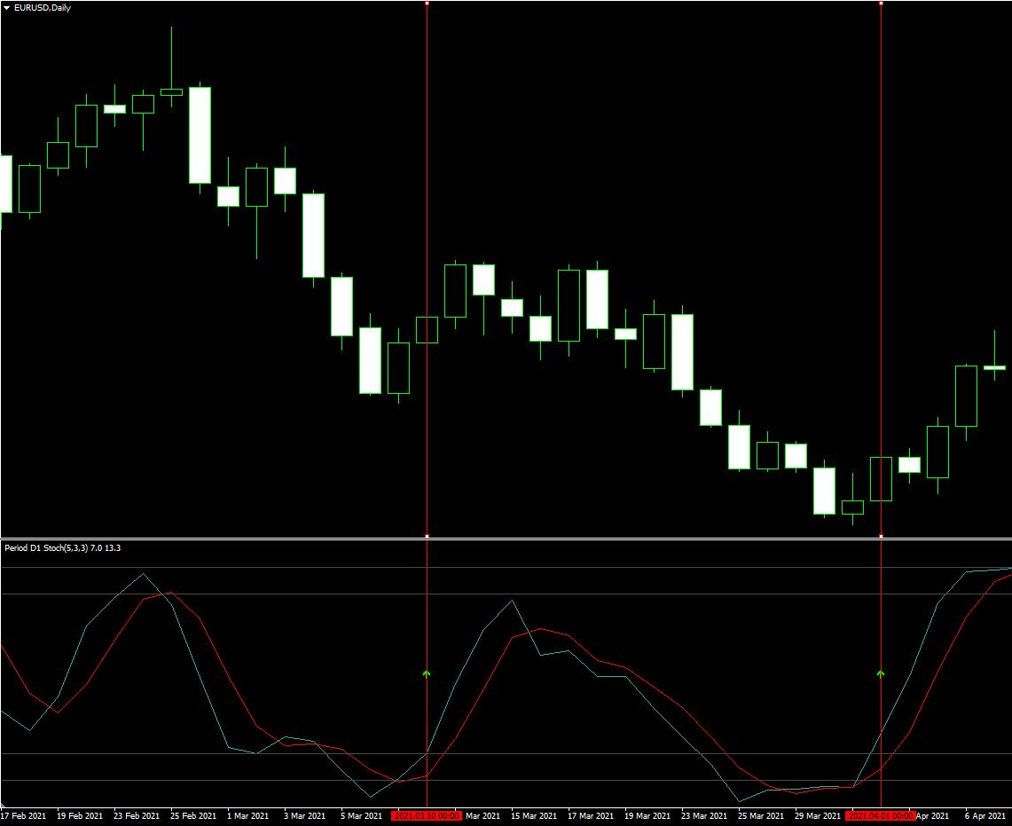 example if stoch now crosses 15, it checks previous 5 bars for the level 10 rule. When first found it draw arrow or does alert.