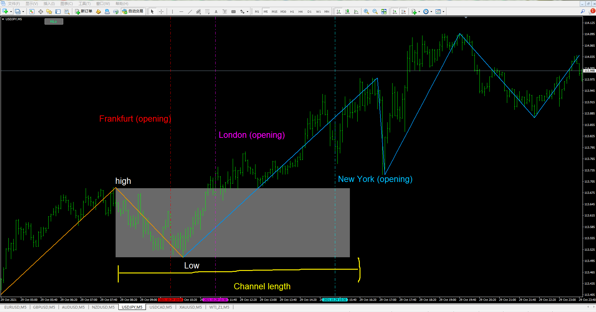 Use the (last paragraph) high and low points of the High-low trend indicator before the opening of Europe or Frankfurt to draw the channel.