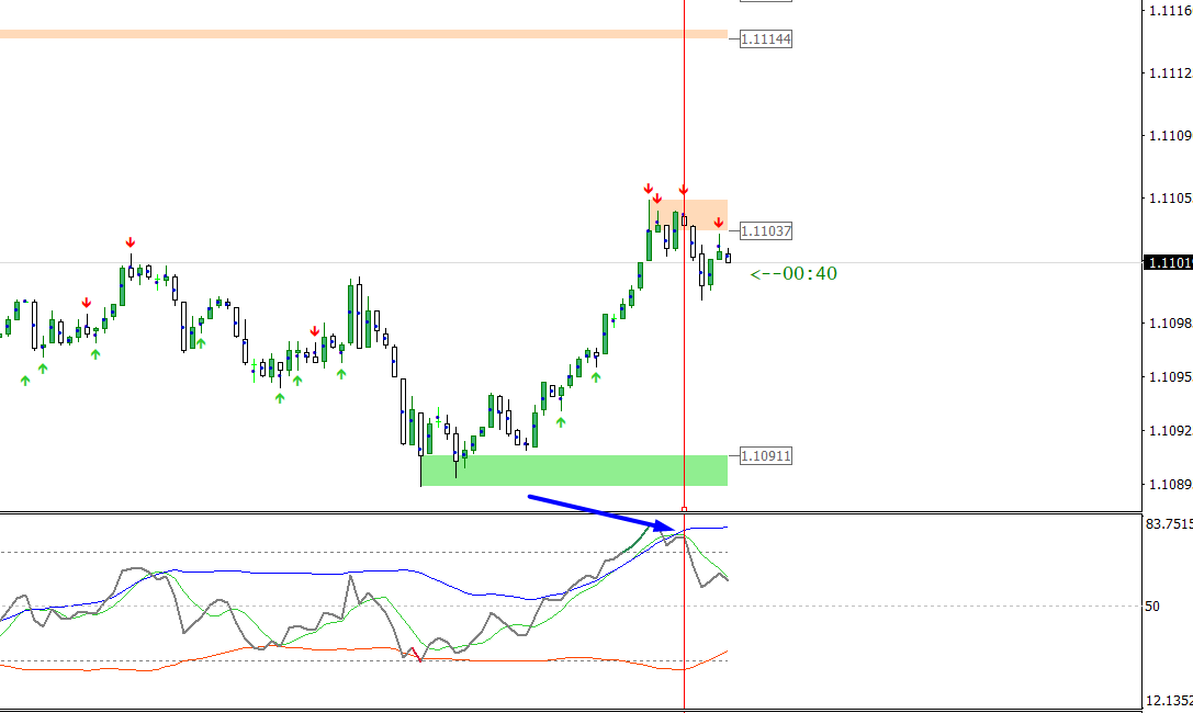 After RSI crosses down from OB level ; crosses MA line & BB upper channel at same