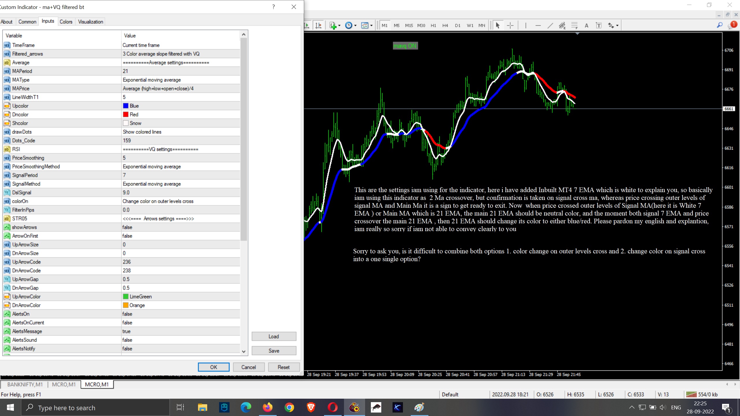 i totally agree with you sir, even i am not looking for second MA(i.e signal MA on chart) my request to you is, in input parameters there are four separate color changing options among those i want two separate color changing options into a single color changing option, so please add fifth option as Change color on outer levels cross + Change color on signal cross. I am using your MA + VQ filtered indicator with below mentioned parameters in the image. I want main MA on the chart, but main MA color changing should affect based on price cross on outer levels of signal period and main MA period and when price along with signal period had crossover with the main MA now its color should change either blue/red. so my request is i want two separate options as one single option i.e "1. Change color on outer levels cross & 2. Change color on signal cross" i want these two options as a one single option for color changing, so if combing of these two options is not possible, i mean i dont know programming so please dont mind me, then in that case please provide me an indicator with this condition and it would really help me alot for my trading carrier, the condition is : " 2 MA crossover with VQ filtering and dsl, for example i use two EMA's 1. Main MA was 21 EMA and 2. Trigger/signal MA was 7 EMA, in general there are so many color MA's available in forum, there function is they change color due to price cross, but here in this case, Main MA color should change based on crossover of price and signal MA, for Neutral/no trade white color should appear when price crosses outer levels of Both signal and main MA, but color change of Main MA should occur only after crossover of 2 MA's i.e Main MA & Signal period. I hope i conveyed properly, please pardon me if iam wrong any where and iam so sorry if iam troubling you. Thank you once again.