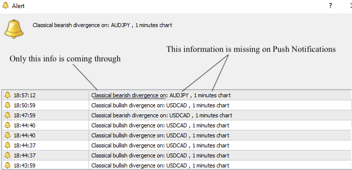 I need your help. You added push notifications to this great indicator. However, it doesn't show the currency pair or timeframe. If you could add that feature, I would greatly appreciate it! It does show the info on Alert (option), but not on notifications.