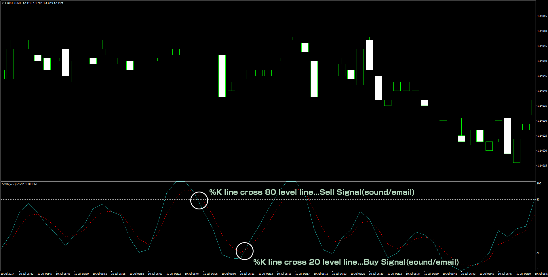 When %K line(green line) below 80...Sell signal.