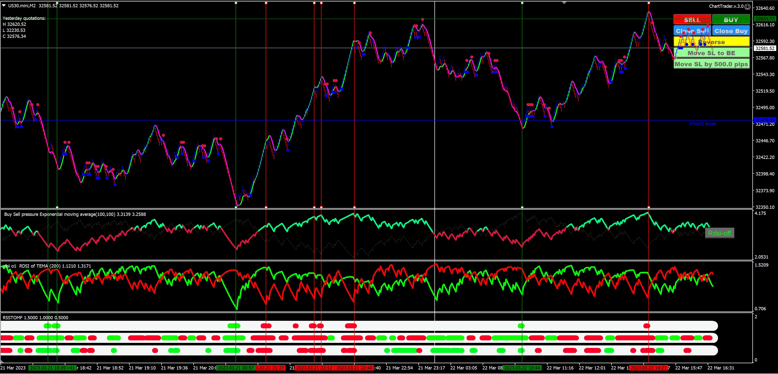 Therefore, this indicator needs to be paired with a reliable trend strength/direction indicator to know when to plow through the fake peaks. The indicator I'm using in the first subwindow is the Buy Sell Pressure (BSP) indicator using Fract's calculations and a 100-period EMA for both the buy pressure MA and the sell pressure MA.