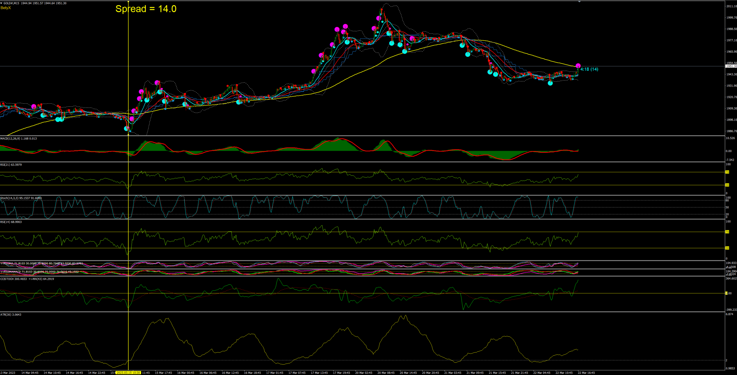 "Well, in my opinion, the combination of RSI, BB, MACD, STOCHASTIC and ATR is better for catching tops and bottoms in one"