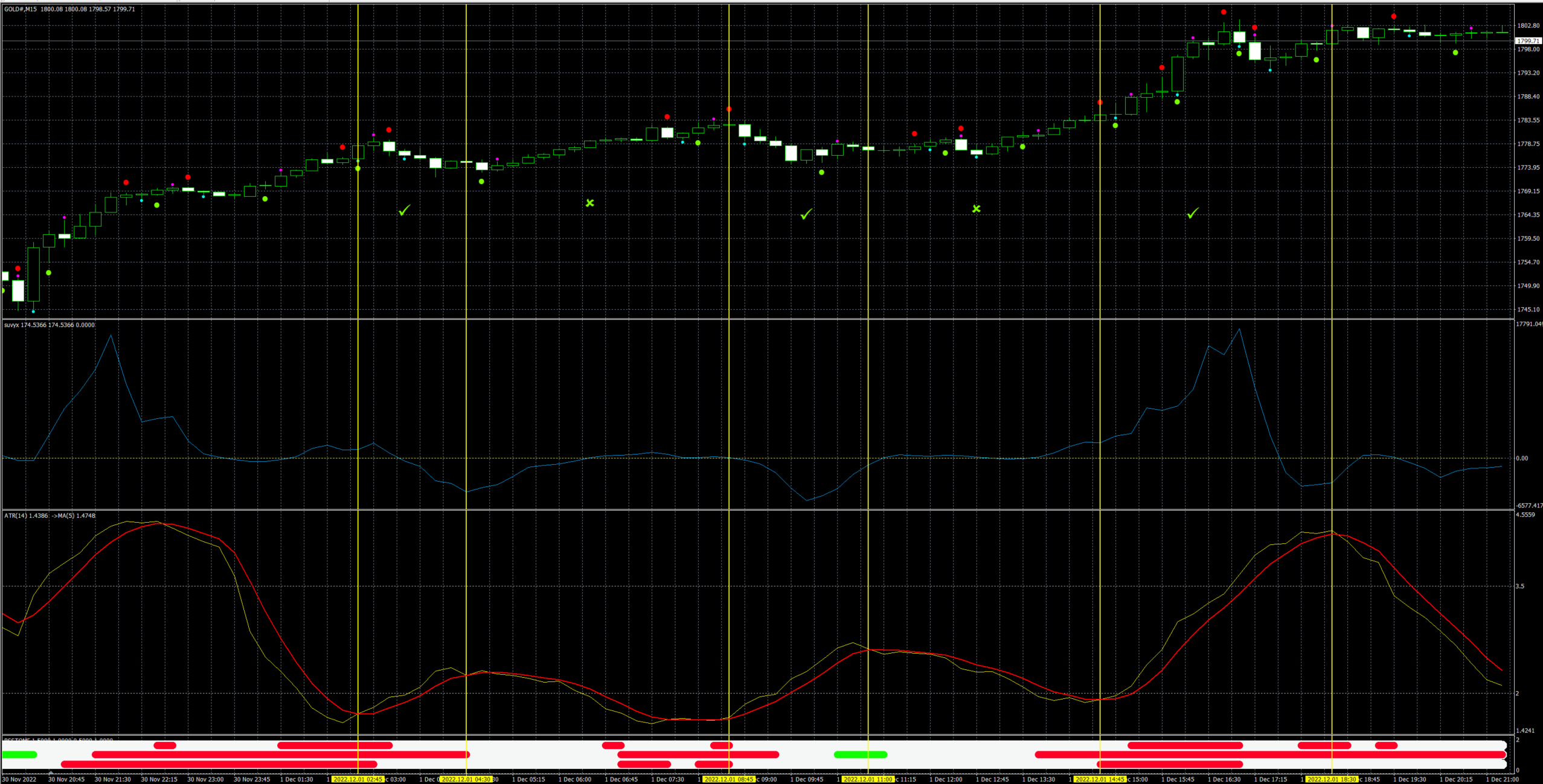 Very promising results so far given it's my very first test. But as with any overbought/oversold indicator or non-repainting top/bottom picking indicator, you need to know when you're getting faked out. You can see this with the four red lines in a row.