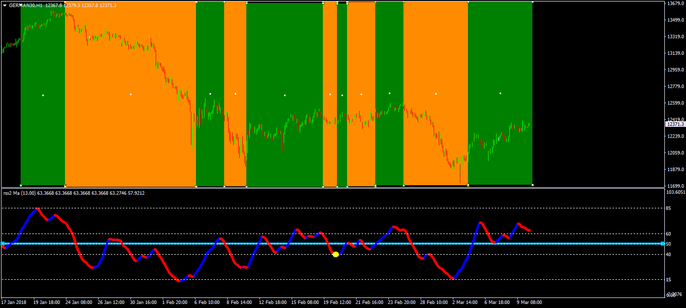 Is it possible to make/code an RSx based indicator that 'paints' coloured zones on the chart when it changes direction in the upper timeframe?