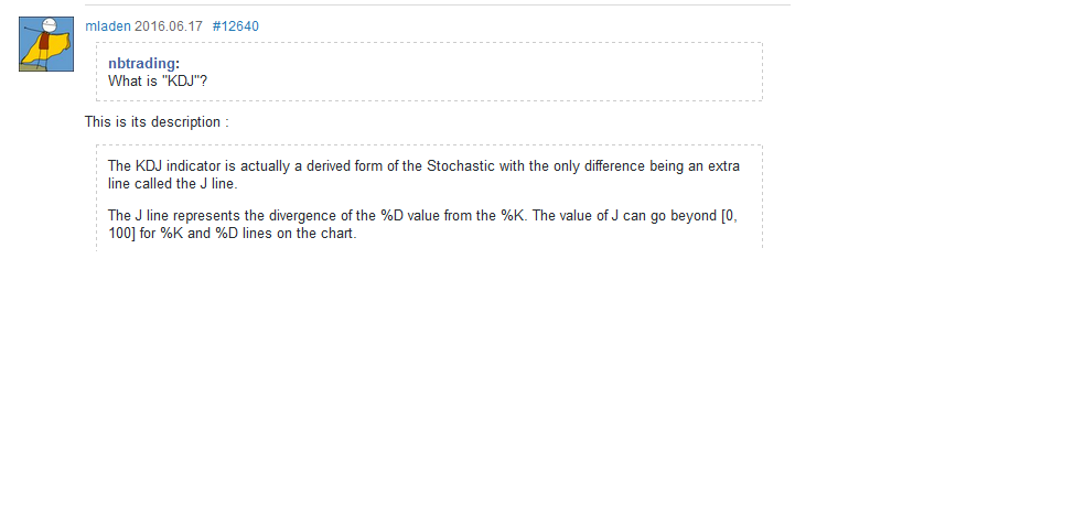 KDJ is simply stochastic indicator with one extra line "J line"vvFish wrote: Sat Apr 07, 2018 4:40 am Dear coders, I ask for your help,
