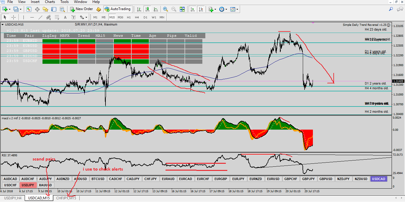 ebeckers Support resistance EA gives scans for SR lines being hit and for a price return. I then see if is a divergence there and enter trade with minimal stoploss. Like this USDCAD sell with RSI and MACD div.