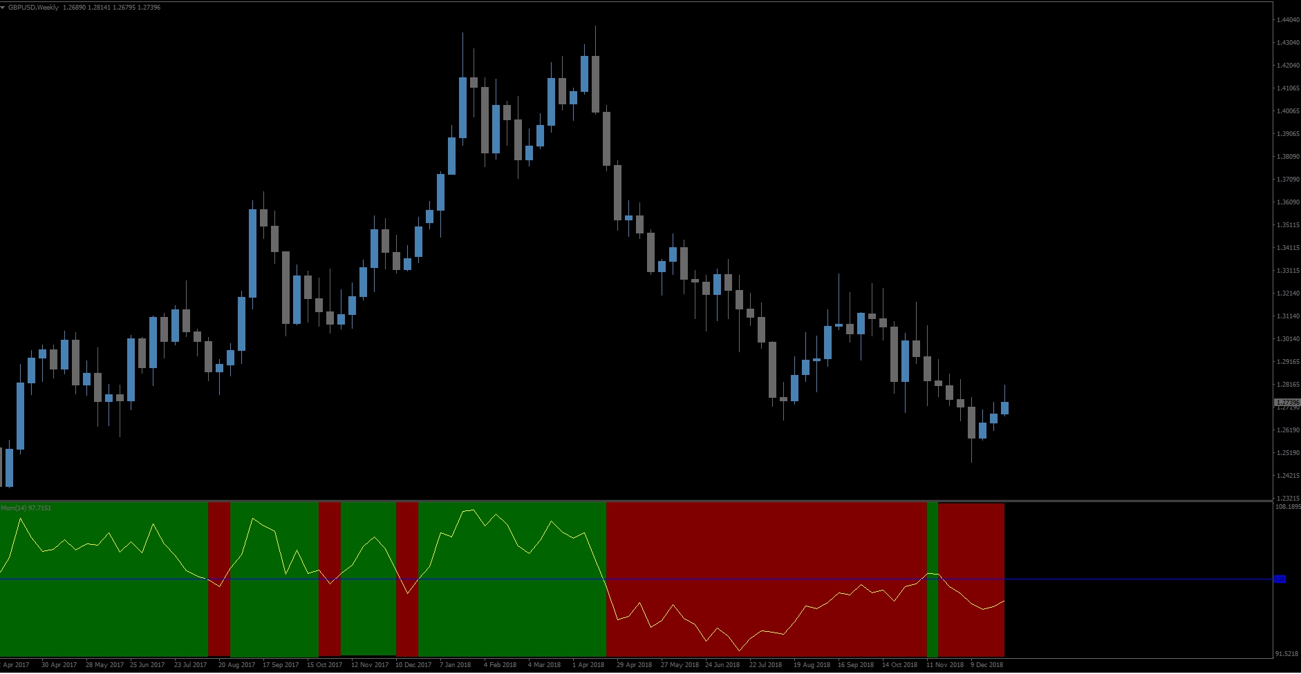 We've got the default MT4 Momentum indicator (attached in the original request) and when the main line is above 100 I would like each candle to paint green bars; when it's below 100 I would like it to paint red bars. I believe this is also called a 0-1 bar histogram, but below is a sample just in case (not from the same indicator) to make sure we're on the same page: