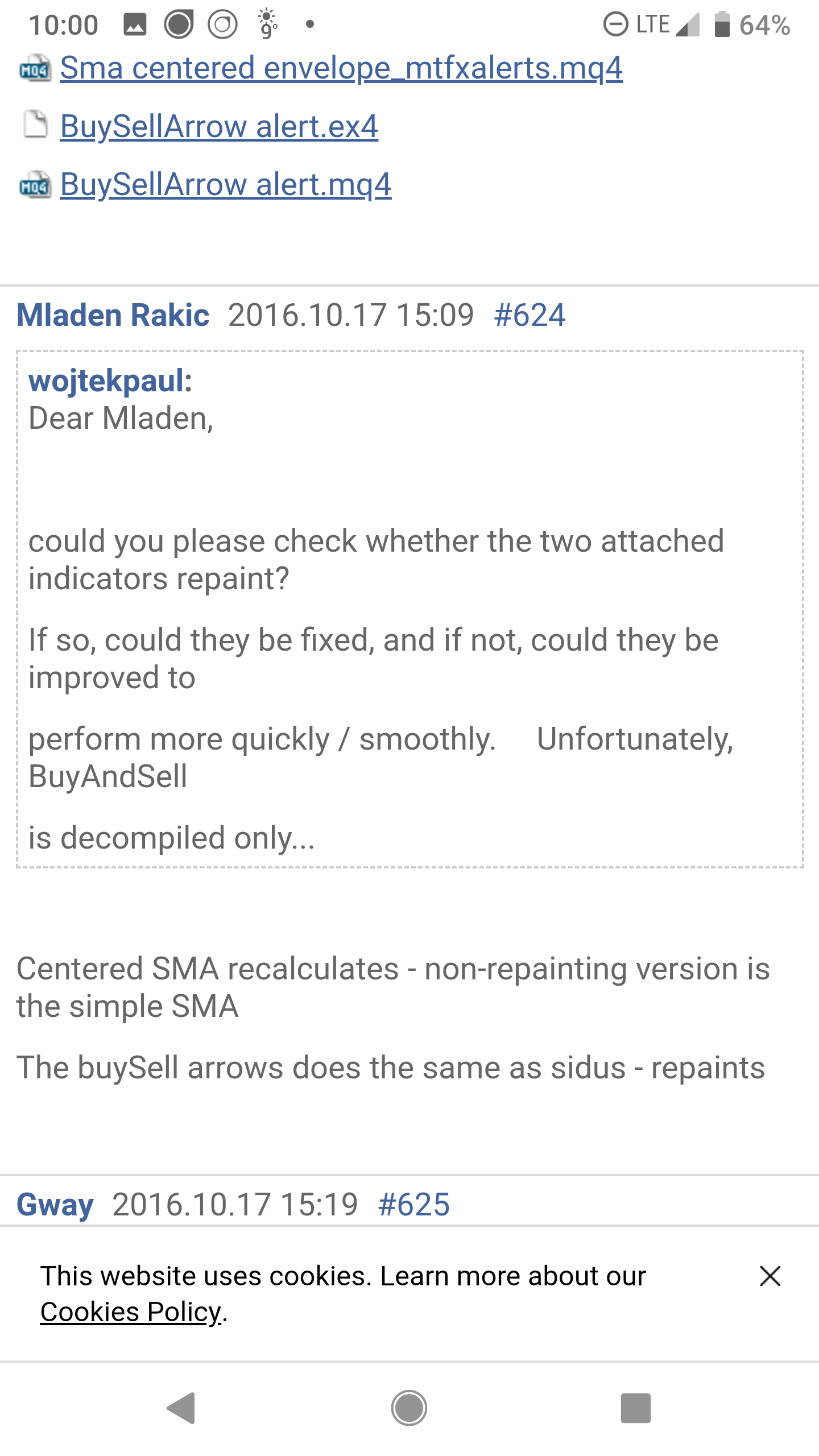 what exactly are u requesting man??? :|Humbl$ wrote: Fri Feb 15, 2019 4:25 am This is from the MQL5 forum obviously you guys are familiar with this indicator surely MQL5 wouldn't leave it up there if it was illegal?? Here is a screenshot of the forum and the indicator. It doesn't repaint for me it just waits for a reversal arrow before printing the first arrow so somewhat annoying. If this isn't the original then there must not be one. Please advise