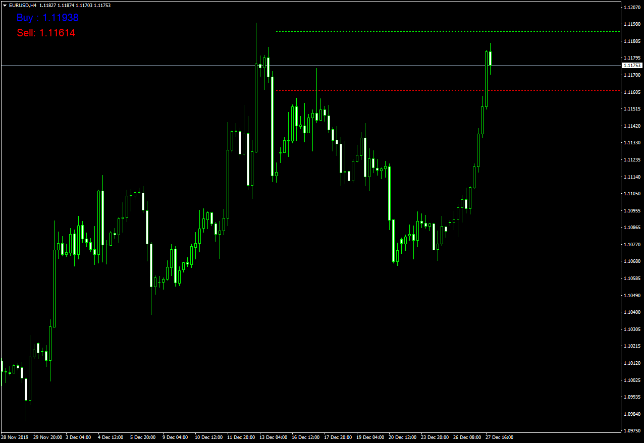 Once the Buy and Sell prices have been calculated the indicator must display in upper left corner of chart Buy = 1.3623 and below it Sell @ 1.3597 or whatever the results are. Please have Buy printed in Blue and Sell printed in Red.