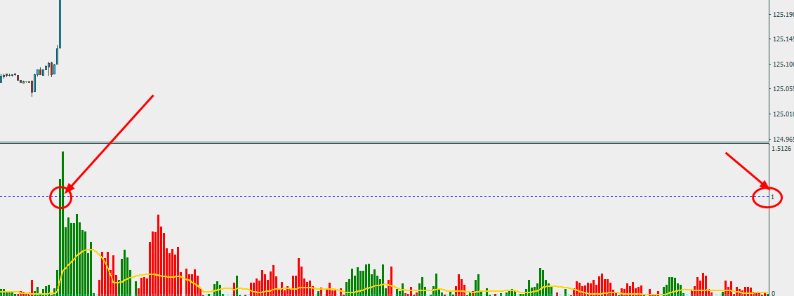 Excuse me, I have added a horizontal line with the value "1" to this indicator. If the "red" and "green" columns touch the horizontal line,
