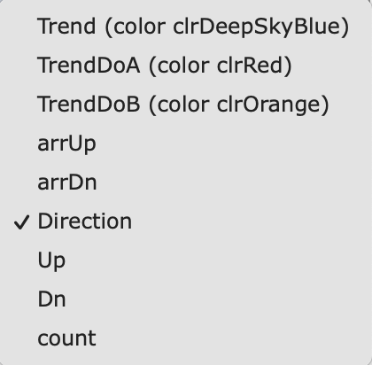 Ok... So the Trendbuffer is "Direction" (-1 for short, 1 for long) and the arrUP and arrDN are the arrows when they appear if it I got you right. But what are the up, down and count values? And what for are the 3 upper Trend values? How to interprete this?