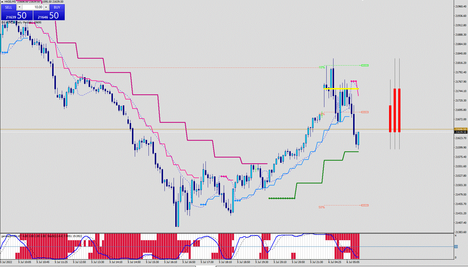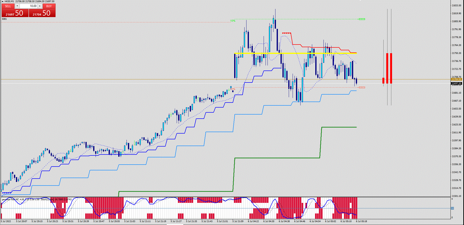 For those relying on subwindow Indicators I have added Kvak's latest creation, the Genesis Histo BT (see Download Section) and put a Stochastic on it. Which then shows clearly what to expect i.e. the Stoch remaining in the "oversold/overbought" area (yeah I know) and then crossing the midline. The Stoch crossing the Midline also is pretty much in sync with the changes of the SSL (or Gann Hi/Lo). So there should be no guessing anymore.