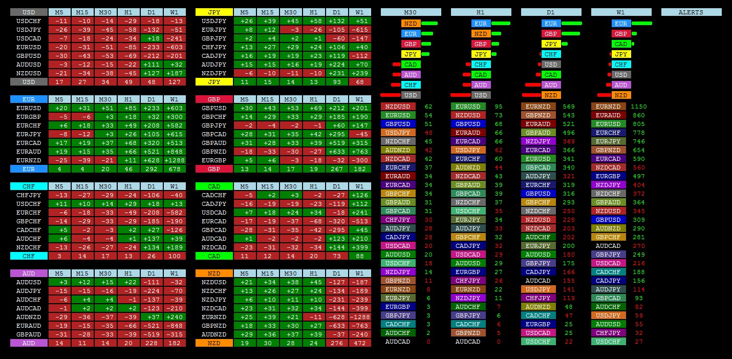 Indicator @VaBank_v3 displays not only the current but also for the previous period (day or week) with complete data on their movement that allows you to track the dynamics for all pairs in a single window. Maximum number of displayed currency pairs - 30. To facilitate the search highlighted a different color pairs with the highest values in the last period. (Color settings, font and font size, and horizontal and line spacing can be changed in the indicator properties)