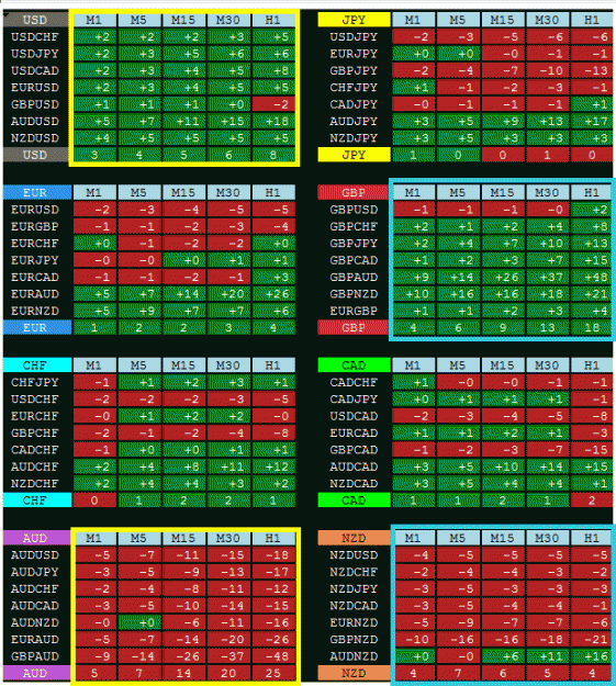 Each currency group has 7 currency pairs; and I will be looking for a group that is showing strength or weakness on at least 4 or more of the associated currency pairs - the more, the stronger or weaker. See this live example taken around 9 pm PST (US/Canada)