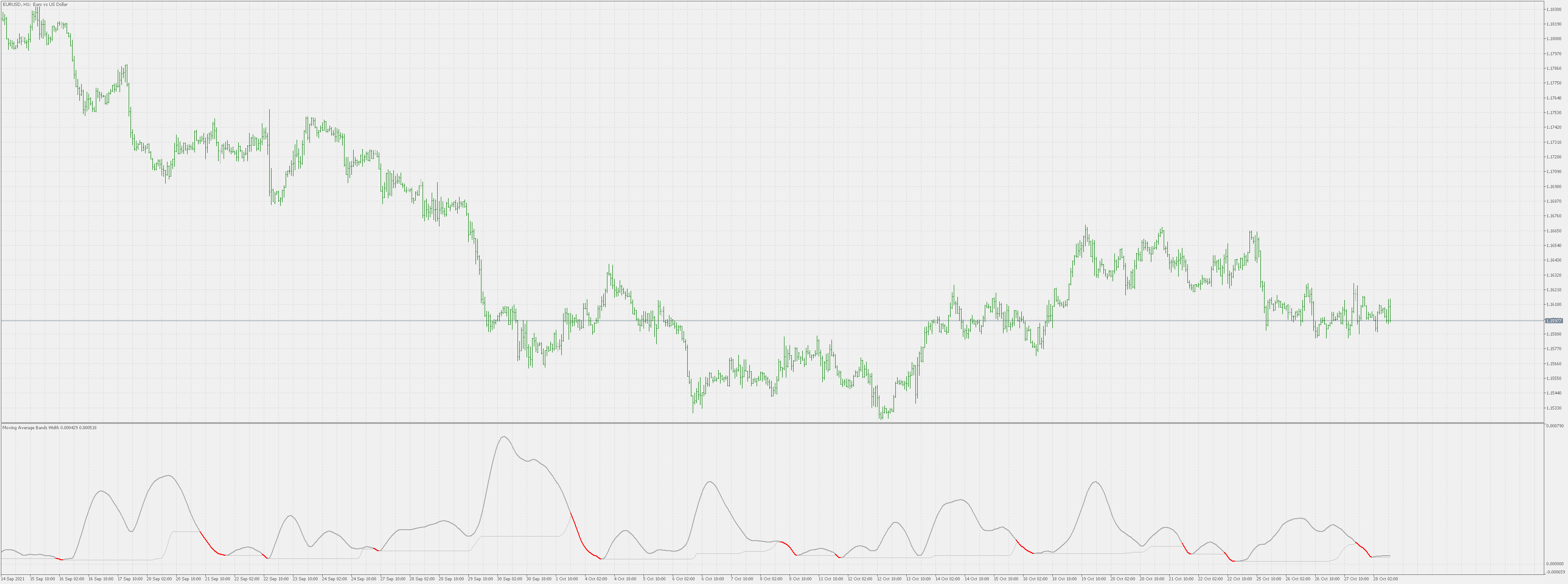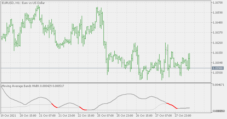 The distance between the bands will widen as volatility increases and will narrow as volatility decreases. The moving average band width (MABW) measures the percentage difference between the bands. Changes in this difference may indicate a forthcoming move or change in the trend.