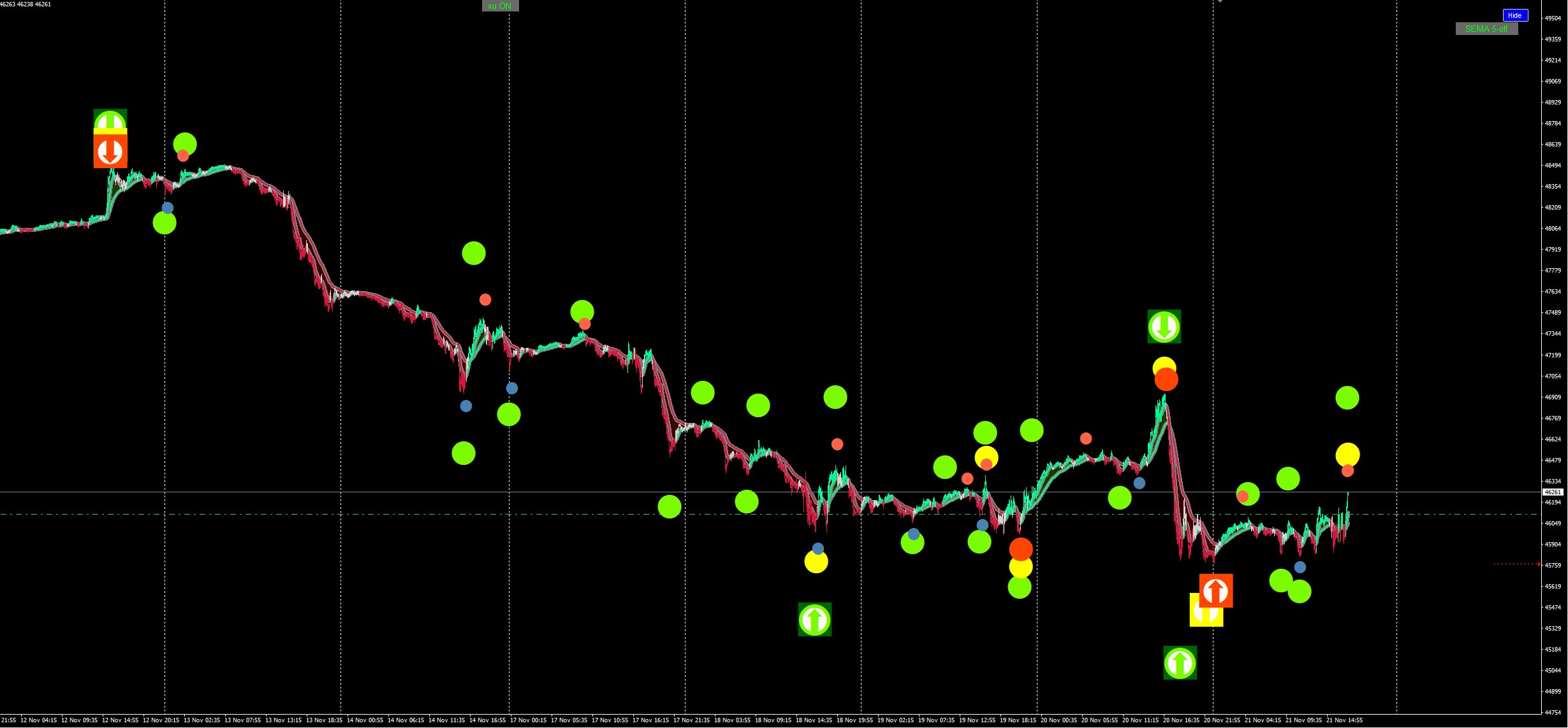 So now after everybody thinking how i would suppose to trade it just put one indi set it to second higher TF and trade by the rules direction of arrow + small dots to big dot .2 big dots to arrow for start it will be enough and i know u will all go straight to one minute but at least u'll be trading from 15 TF.