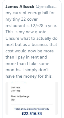 Power price rises expected to force 70% of hospitality businesses in the UK to close for good.