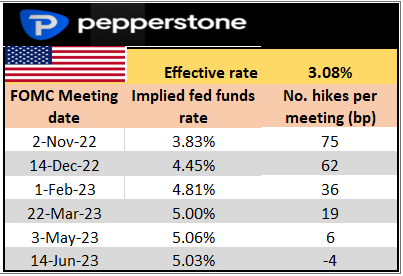 We also look at the terminal rates pricing – this is the peak of market expectations for where the Fed can take rates, which currently sit in the May to June 2023 period at 5% – we can type in ‘100-ZQK2023’ into the navigator. A firm break above 5% would send risk lower.