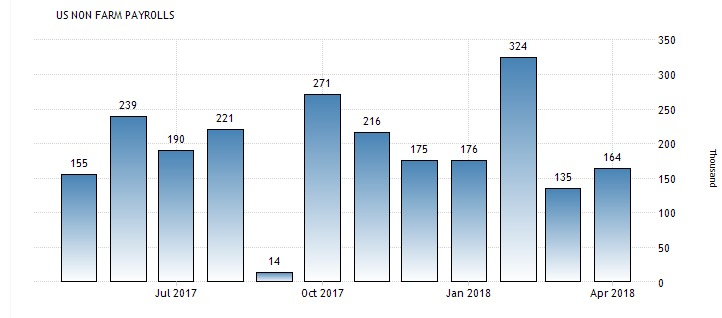 21Non farm payrolls in the United States increased by 164 thousand in April of 2018, following an upwardly revised 135 thousand in March and well below market expectations of 192 thousand. Job gains occurred in professional and business services, manufacturing, health care, and mining. Let's see what's gonna be statistically for may