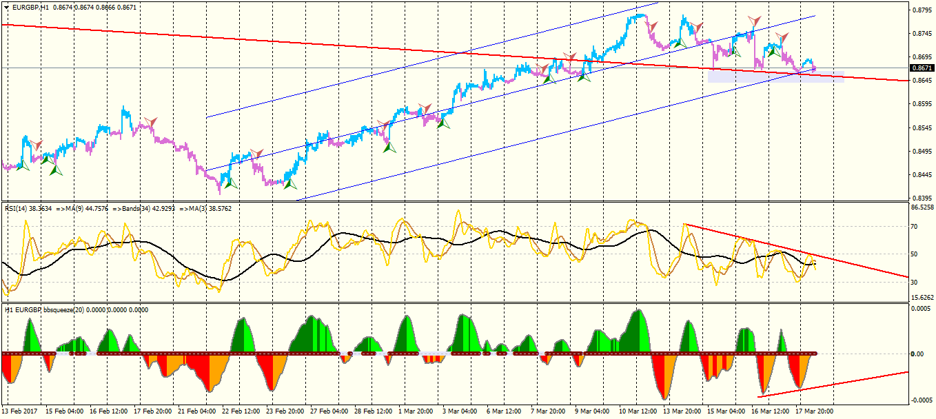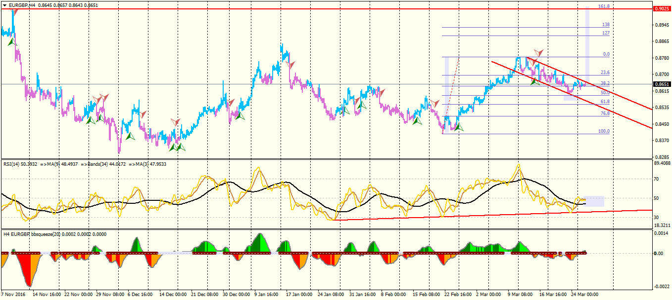 Based on the above link and figure , we have a bullish flag on the EUR/GBP H4 chart , RSI on 50 center line , bbsqueeze engine is on , price stands on 50% fibonacci , so it would be a good long position , if we will have a powerful break and two moving averages cross . Target ( as I show on the above figure ) can be set at 0.9 , also it means 161.8% fibonacci , an important level in price moving .