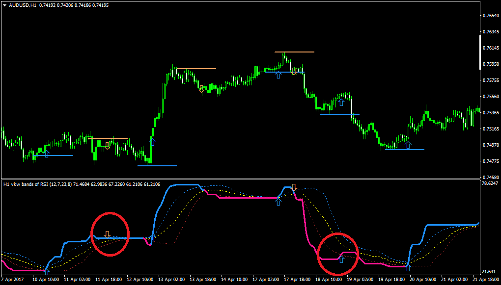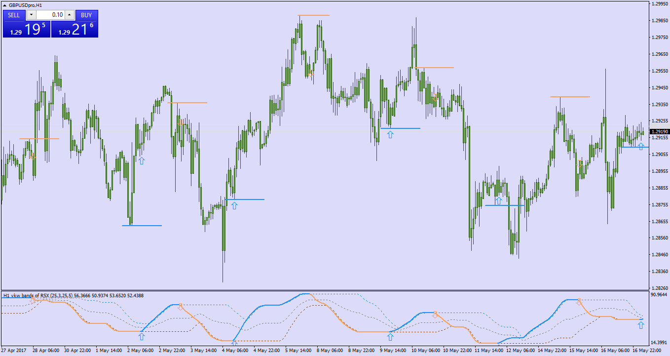 VKW Bands is a momentum display indicator which includes a stepping adjustment and smoothing. It's primarily used for scalping and to determine where pending orders should be placed.