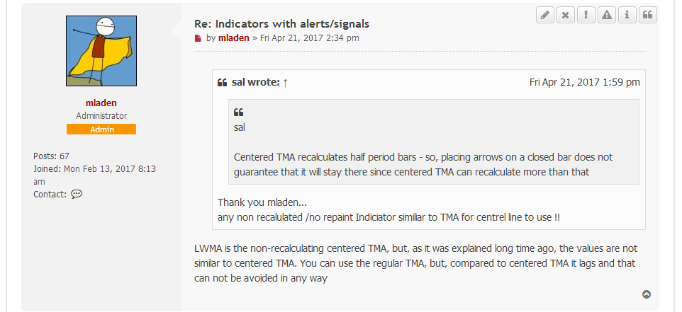 mladen wrote: Sun May 21, 2017 7:09 pm Any indicator that is made non-repainting is not going to produce results like the centered TMA. That is the "price" of repainting and not repainting