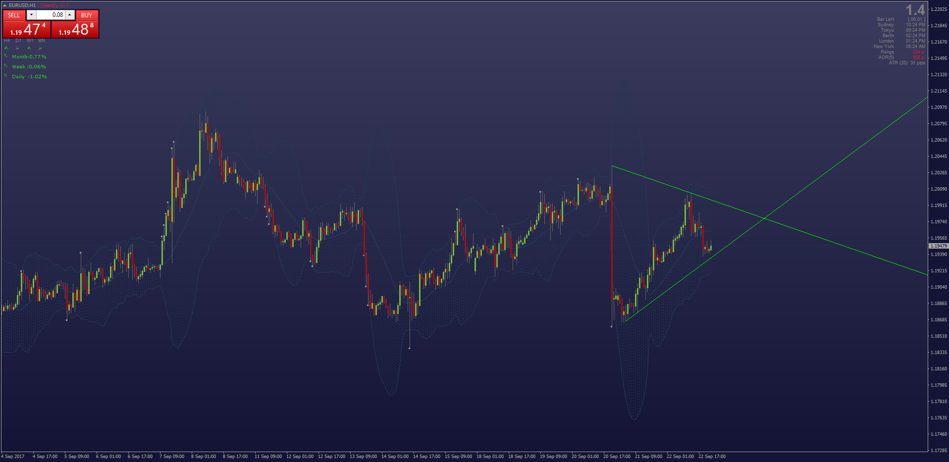 - Whenever price on the 1 hour chart touches or breaks through the outer Bollinger Bands on settings 20, 3