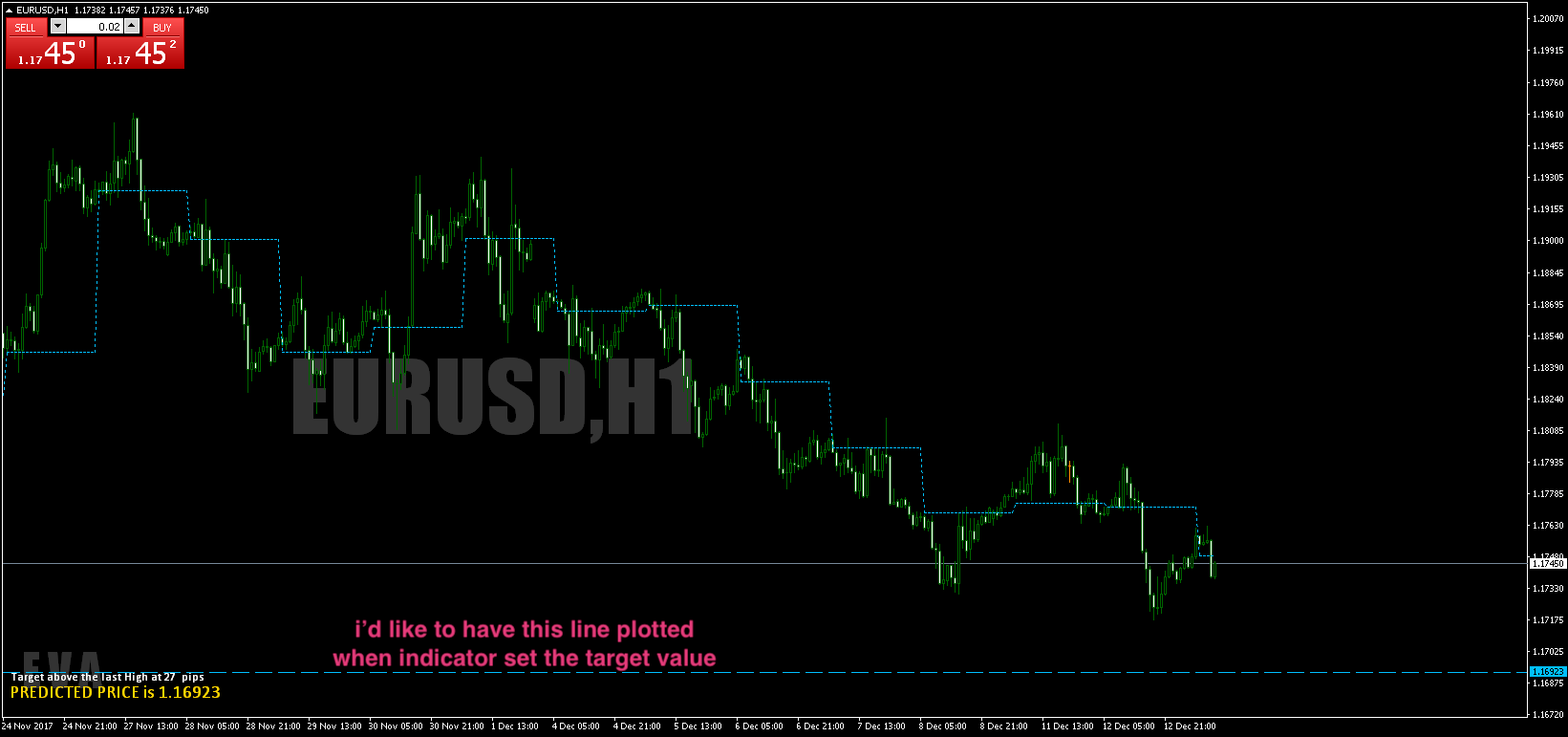65Hi guys i found this simple indicator, which helps me to exit the trades. It predict a price on the low left screen, but i'd need it to plot also a line at such target value, just like this example: