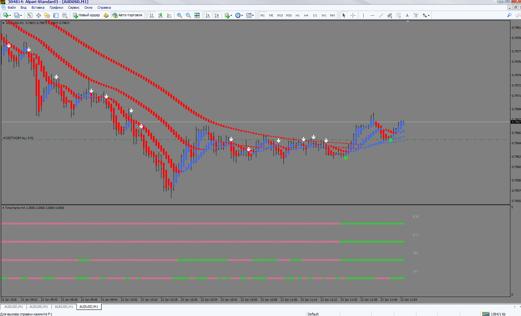 In the screenshot you can see that the indicator on the chart M1 to M30 period has already given the signal, and the indicator in a separate window yet. He then redrew several bars and arrows appeared with the big delay. The more they are still blinking