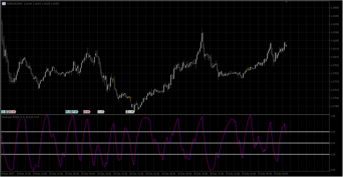 Standard RSI may not show market cycles or volatility changes. In case the market enters trend state, RSI often is not able to reach the appropriate level that can trigger position opening signal according to the trend direction. Implementation of Stochastic oscillator to RSI creates a dynamic indicator that better corresponds to its current volatility.