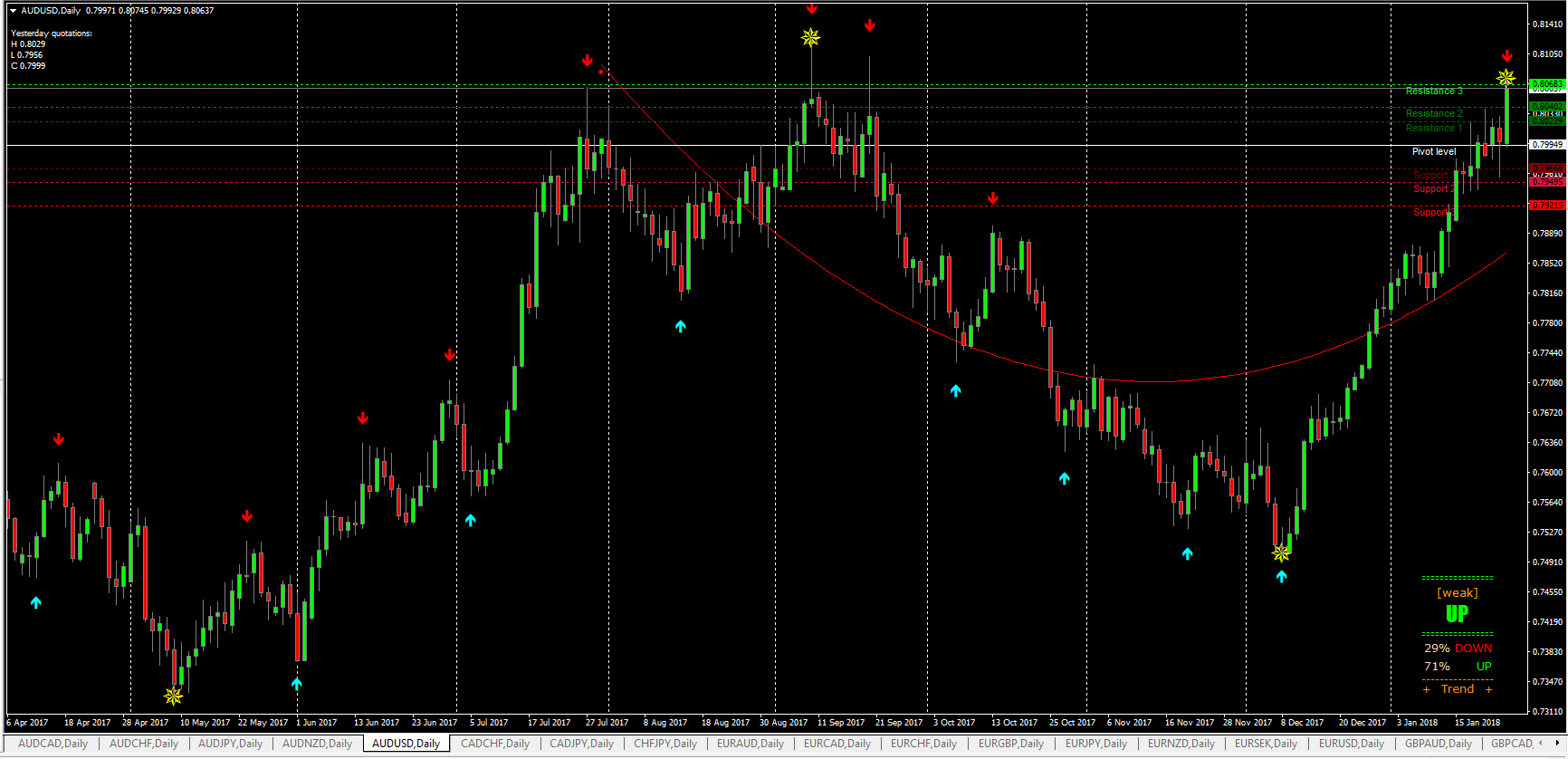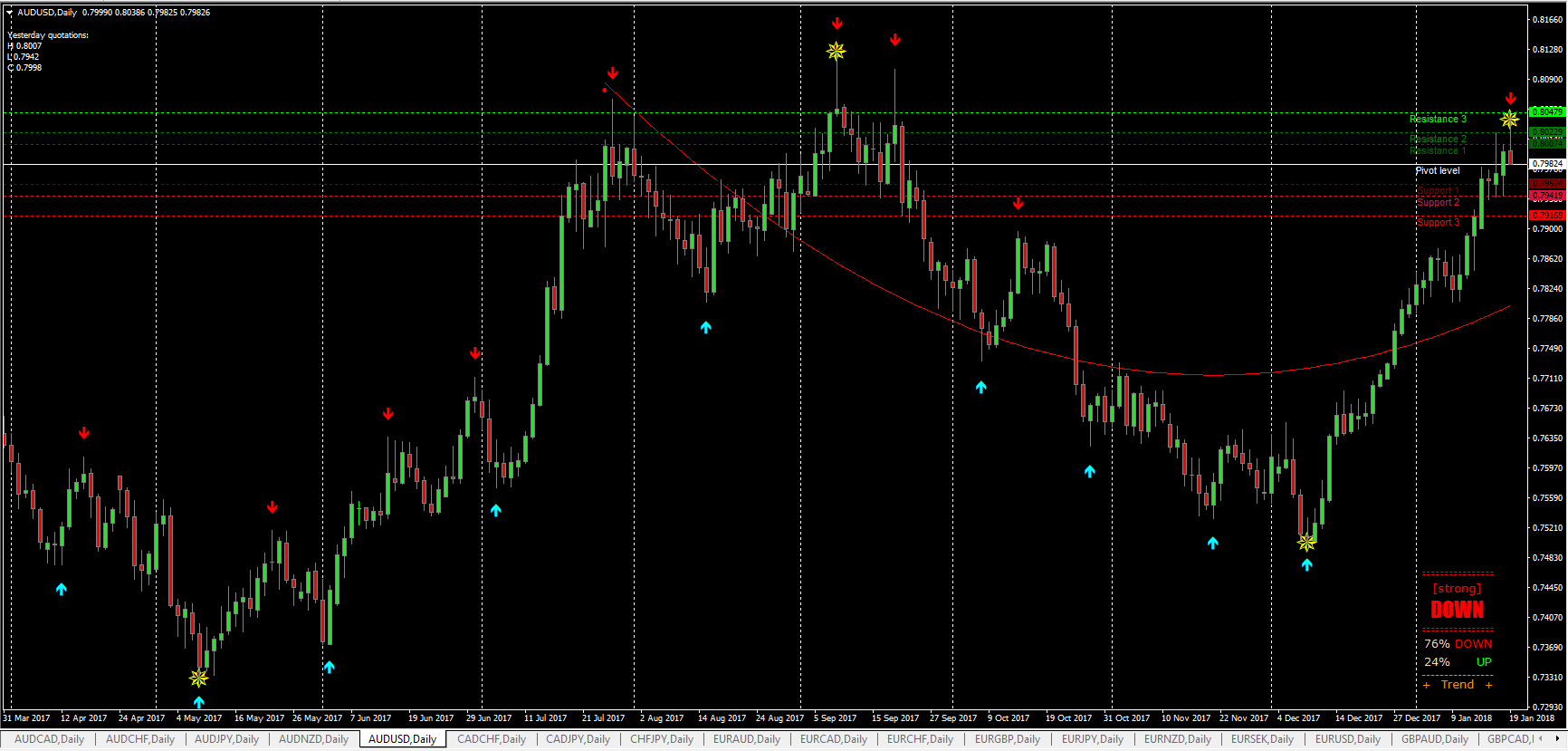 52Sometimes the arrows do move to the next day's candles but I have not seen the signal change from buy to sell or sell to buy. See the charts of the AUDUSD, The first one was taken on 19 January and the second one was taken today, 24 January. I do not know which indicator generates the arrows.
