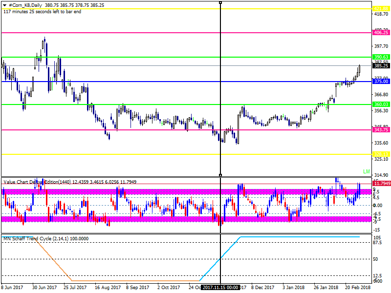 Also if any other fellow traders are interested, this indicator is very useful for identifying trends. I use Murrey Math on longer time frames. A challenge with Murrey Math is that although you know price is at a reversal level, it helps to have some kind of way to confirm that the reversal area will hold. For example in the attached chart I have corn futures. At 11/15/17 price was in the reversal zone between MML 2/8th and 1/8th. For corn futures I found the average monthly cycle to be about 28 months. Therefore, the settings that I use for the Schaff Trend Cycle-Gaussian Filter Velocity indicator are: