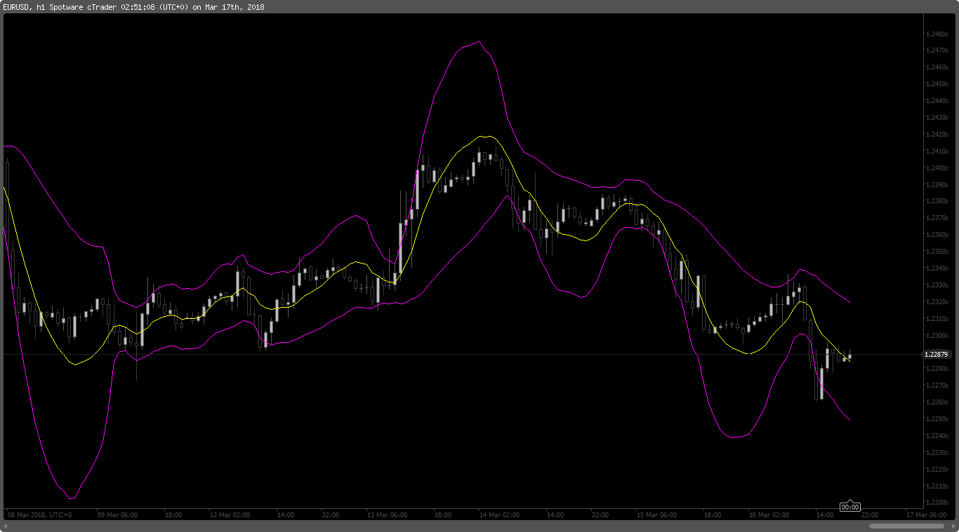 The upper and lower channel lines contain between themselves either 68% of all prices (if 1 standard deviation is used) or 95% of all prices (if 2 standard deviations are used). When prices break outside of the channels, either :