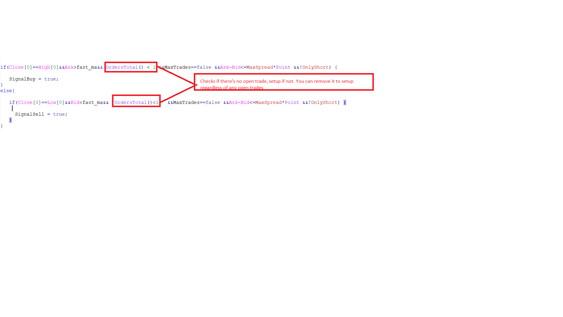 Note that on the pic I formatted your code so that I can read it. You can simply remove OrdersTotal() < 1, or increase the number to any number of trades you want to allow open concurrently.