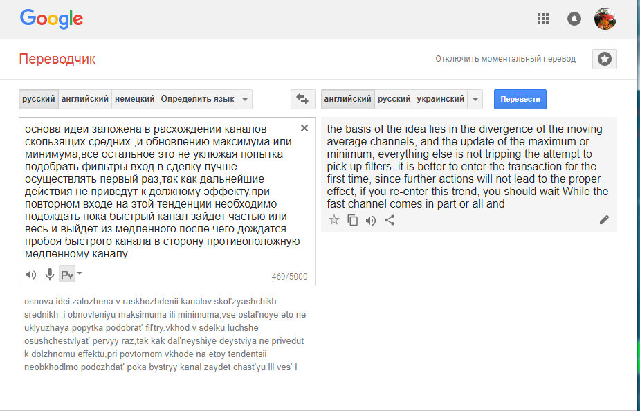 krakin wrote: Sat Aug 11, 2018 5:16 am основа идеи заложена в расхождении каналов скользящих средних ,и обновлению максимума или минимума,все остальное это не уклюжая попытка подобрать фильтры.вход в сделку лучше осуществлять первый раз,так как дальнейшие действия не приведут к должному эффекту,при повторном входе на этой тенденции необходимо подождать пока быстрый канал зайдет частью или весь и выйдет из медленного.после чего дождатся пробоя быстрого канала в сторону противоположную медленному каналу.