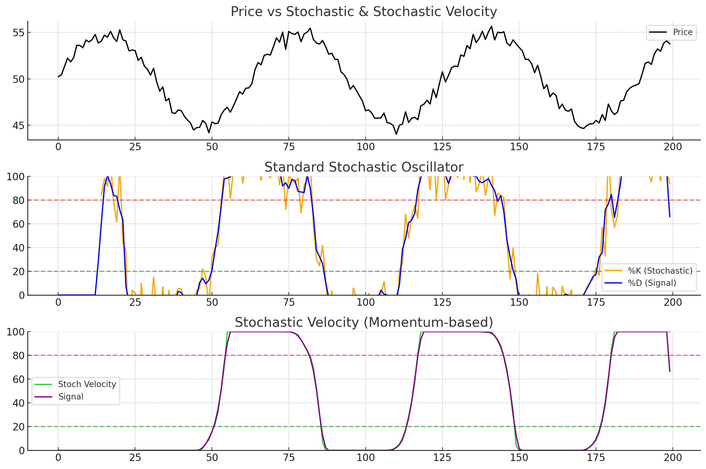 In the chart below, we can observe that the Stochastic Velocity responds sooner compared to the traditional Stochastic; it adjusts to shifts in momentum (velocity) instead of delaying for the price to reach the high or low extremes.