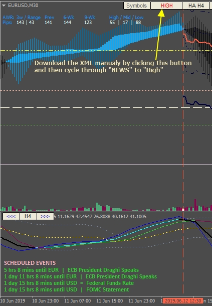 The News Events ─ FF calendar based indicator is fused with button control for News impact/filter selection, tooltip and news line.