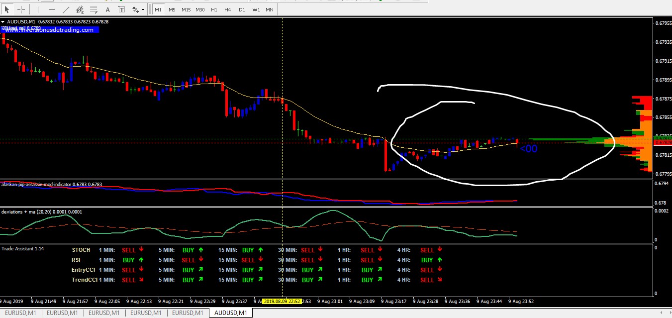 In a downtrend or sell market, only enter a sell option when the red line of the alaskin pip assassin is above the blue line and when a deviations cross over has also been confirmed..price must be below the 20 ema on the chart and more confluence is added when the trade assistant panel also indicates more sells..If price is far below ema on the chart wait for a retracement close to the ema and sell then as long as the above conditions are met...