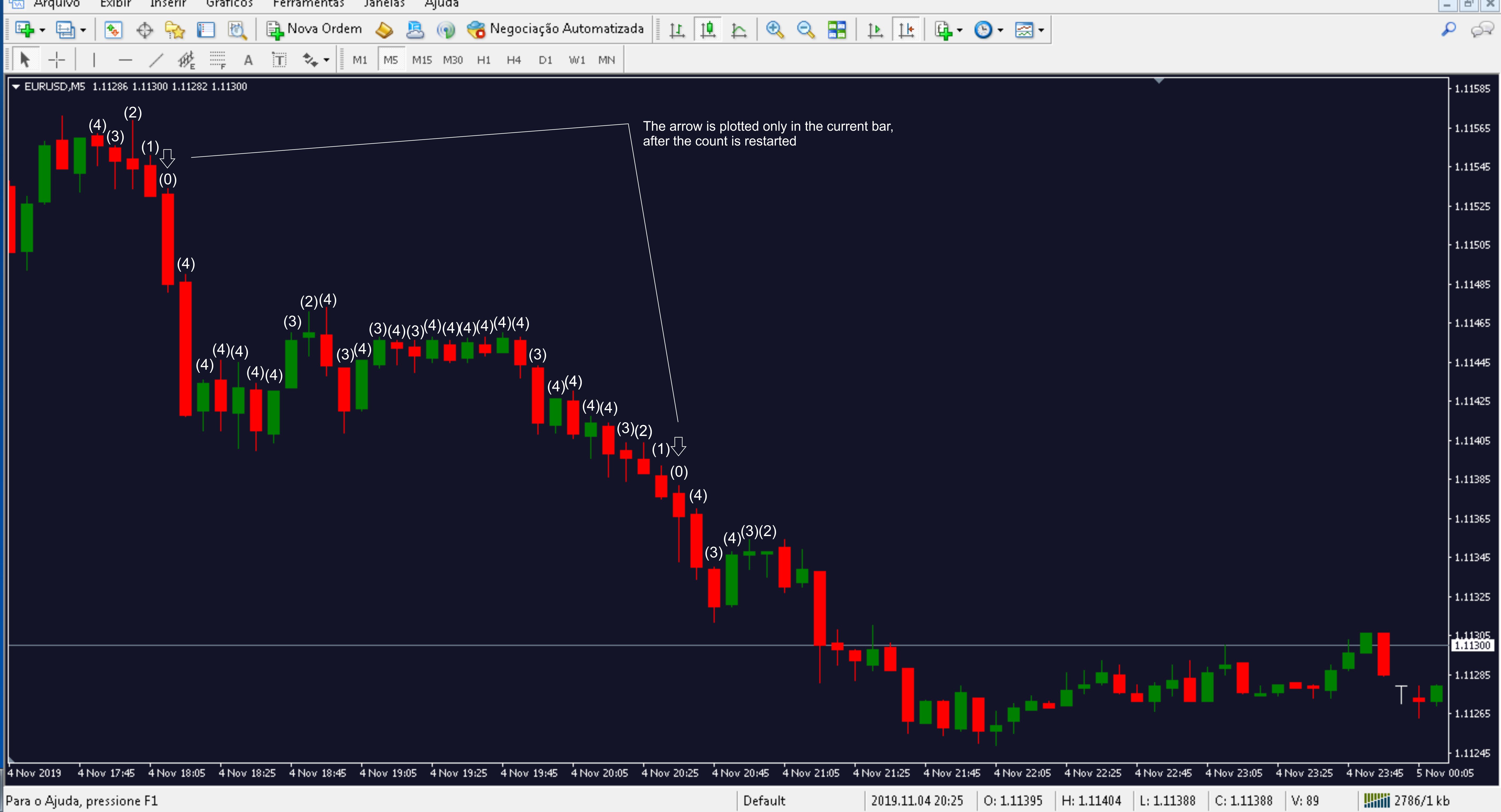 However, the indicator I search for displays a bar counter specie in the same direction and when it reaches the number of bars specified it displays an arrow in the direction of the current bar and the count restarts from the beginning.