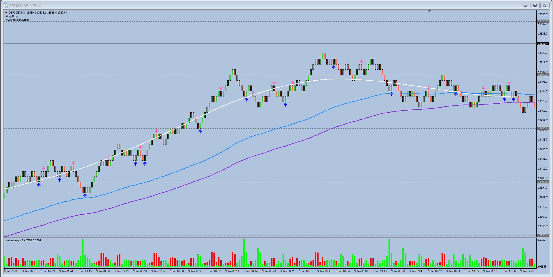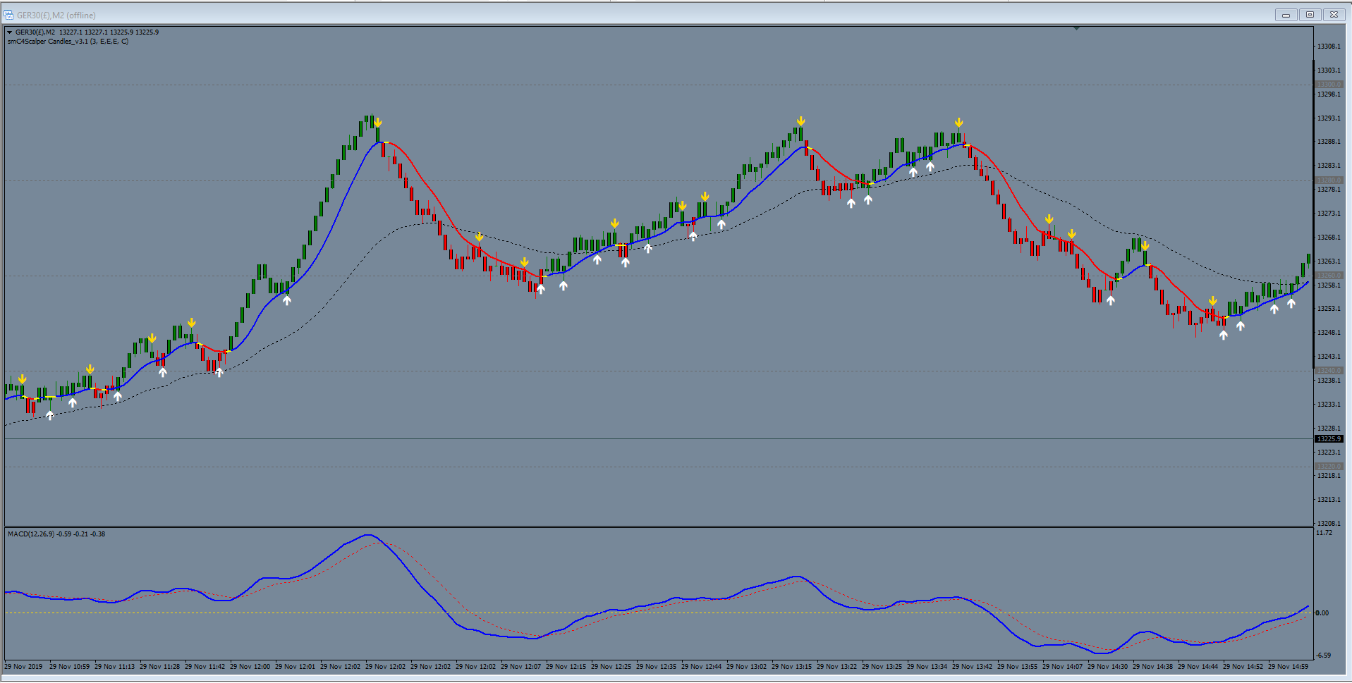Arrow entry trigger when matched with colour candles, sloping colour MA and slope of MACD.