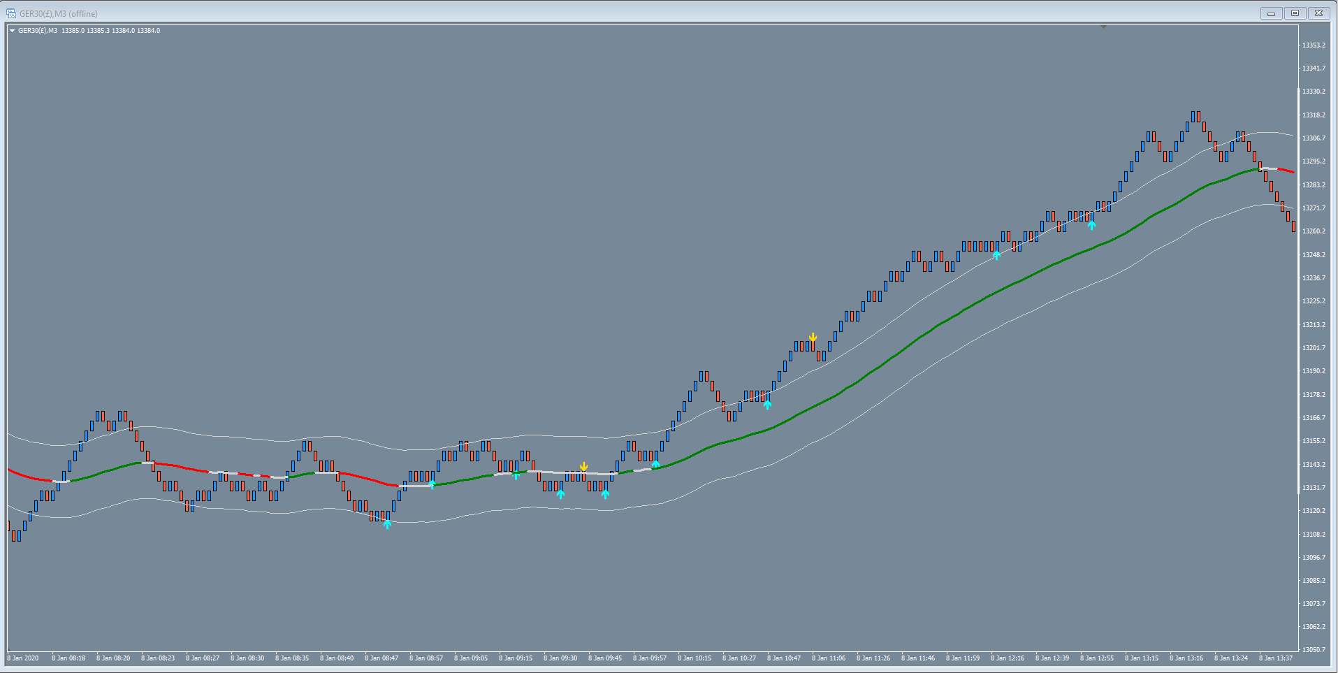 Hi Guys, hope this might be of some use to someone. It's a Renko chart based manual system seen here on a 3 point Renko bar Dax chart. It's based on a strategy found online called Mr Nims Forex Renko Chart Strategy (free).