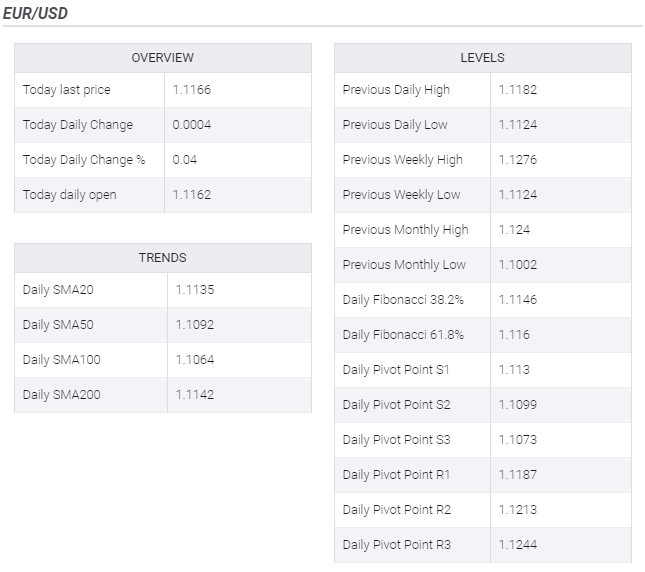 EUR/USD is hovering near 1.1165, as the US dollar is struggling to gain ground amid broad-based risk aversion and the losses in the treasury yields.