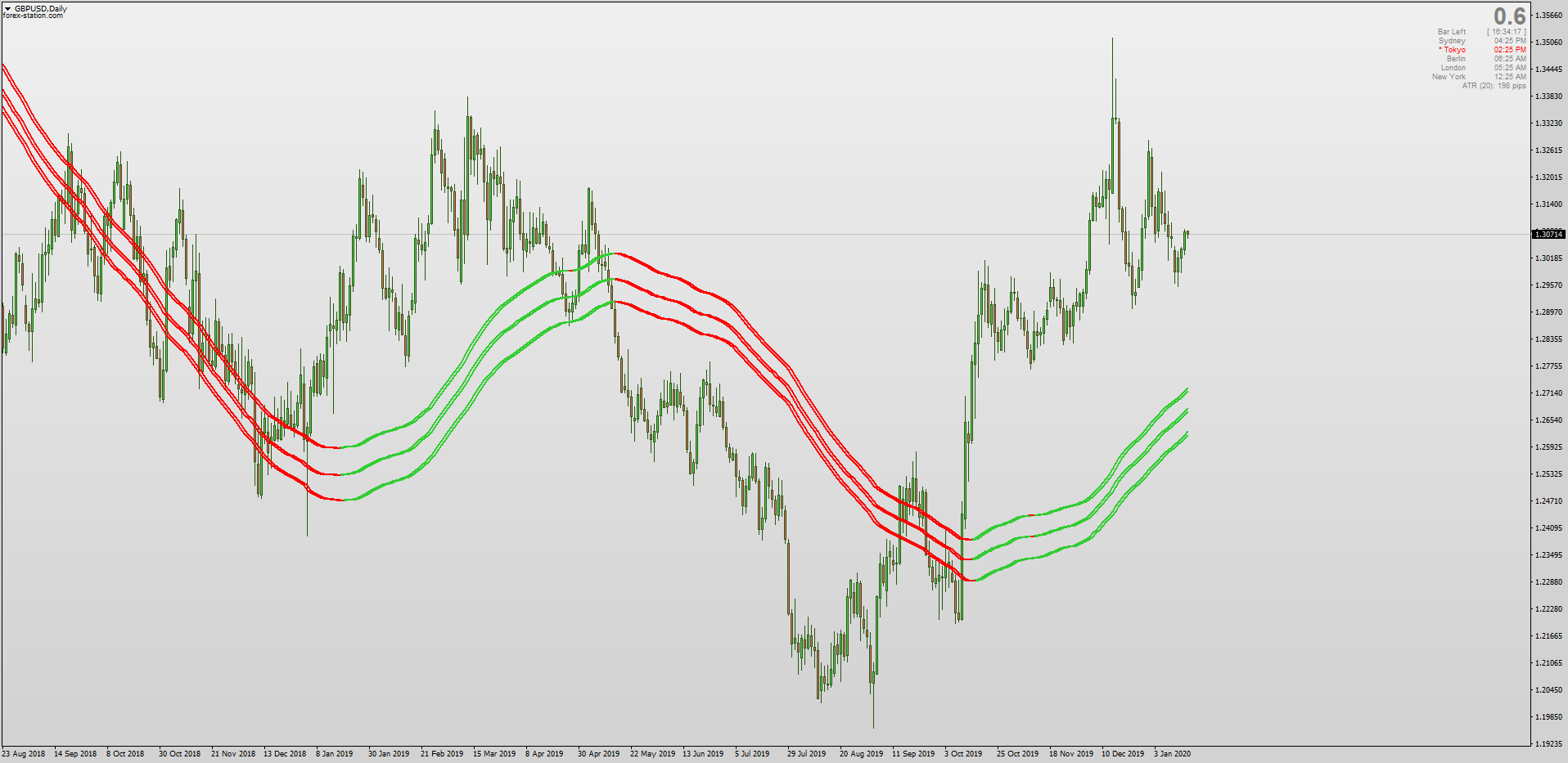 - When price is above all three lines, wait for all three triggerlines to turn green then enter long