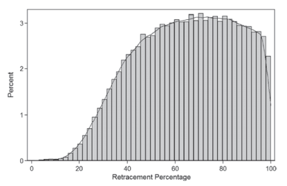 "This chart shows swing retracements across the horizontal axis. (E.g., 60 means that the swing retraced 60% of the previous swing.) You can see that the peak is somewhere